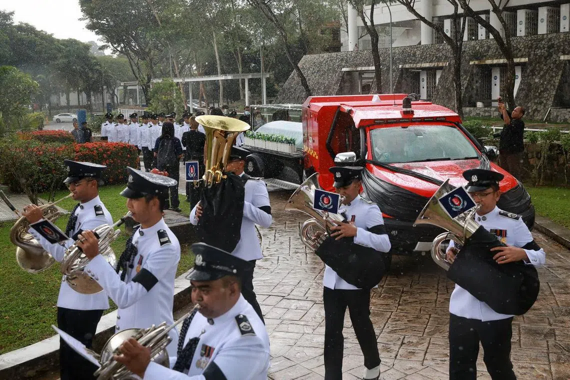 The pallbearers then moved the casket onto a carriage, which was linked to a Light Fire Attack Vehicle, more commonly known as the Red Rhino, for the ceremonial funeral procession towards a hall for the funeral service. The Singapore Police Force Band led the procession.