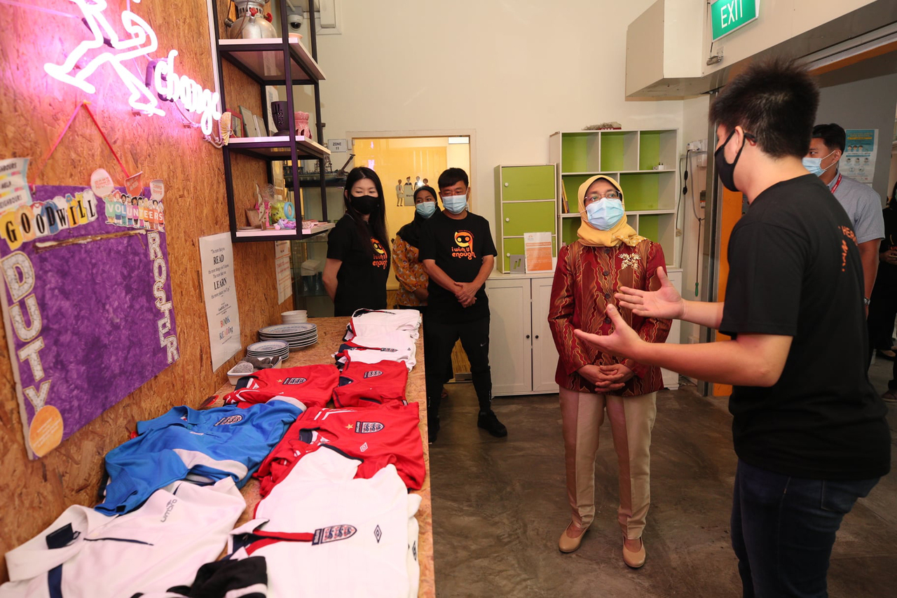 (From right) SCC FSC volunteer Yong Liang sharing with President Halimah Yacob about the Goodwill Exchange corner on April 22, 2021.