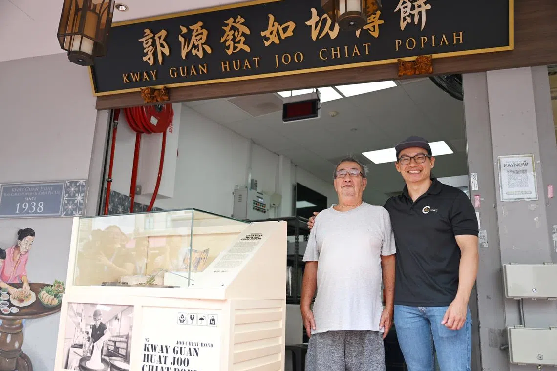 Mr Michael Ker (right), third-generation owner of Kway Guan Huat Joo Chiat Popiah, with his father, Mr Ker Cheng Lye.
