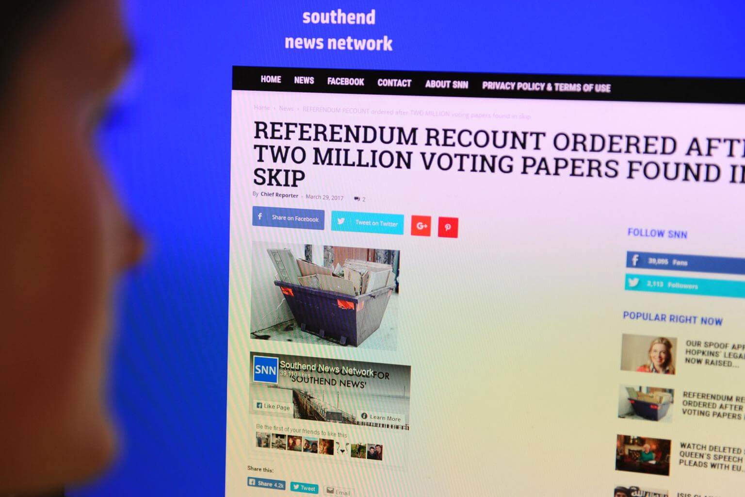 A journalist poses reading a satirical fake news story on the Southend News Network website in London on March 31, 2017.
