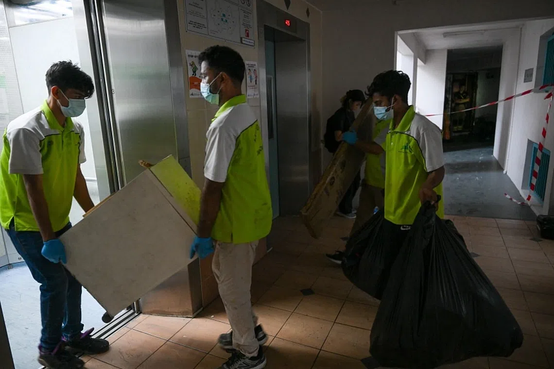 Town council staff clearing items from the flat in Hougang Street 91 on Jan 10, a day after a fire broke out in the unit.