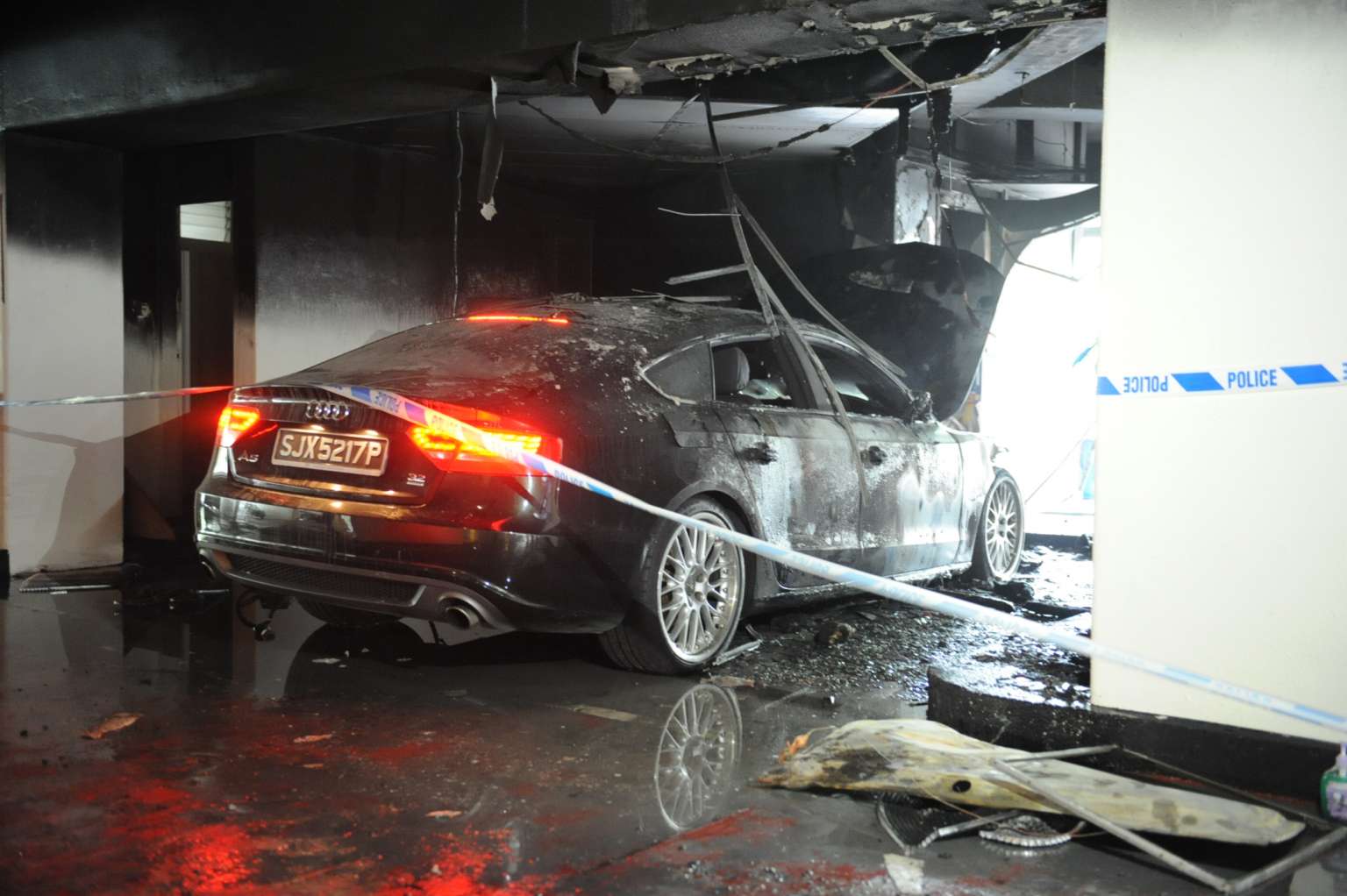 Forty residents evacuated The Arcadia condominium near Adam Road yesterday morning after a fire broke out in a carpark.The top part of an entrance to the carpark and its ceiling were scorched and wires could be seen dangling from the ceiling. The front of an Audi car was also damaged. The blaze occurred at about 6.45am near a resting room for chauffeurs of condominium residents. It is not clear what caused the fire, or where it started. The Singapore Civil Defence Force put it out within 15 minutes and is investigating the cause of the fire. There were no serious injuries.