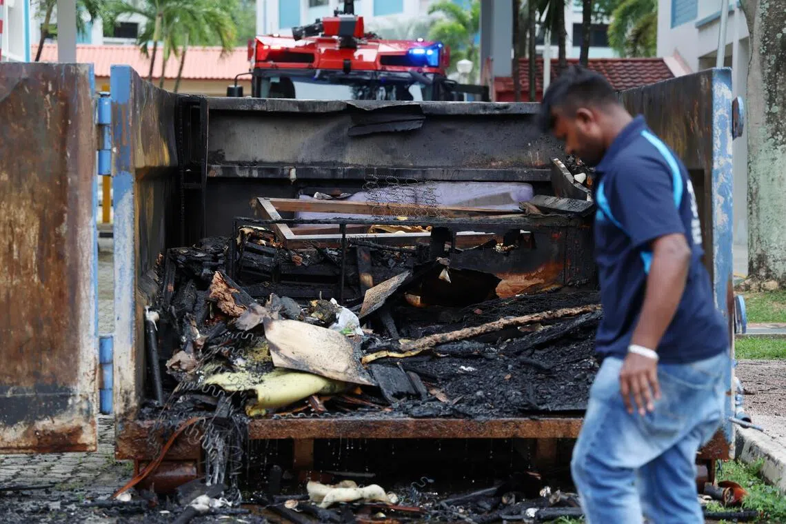 It added that parts of the rubbish container were blackened by the fire, with furniture inside the bin, including sofas and bed frames, reduced to ashes.