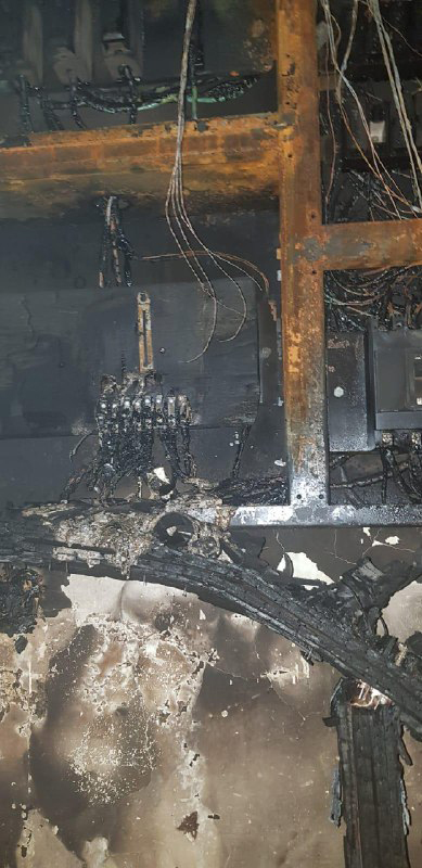 Other photos show the interior of the office was badly burned, with the walls, ceiling and floor completely blackened and littered with ash. There were dangling beams and exposed wiring where the fire had damaged the ceiling.