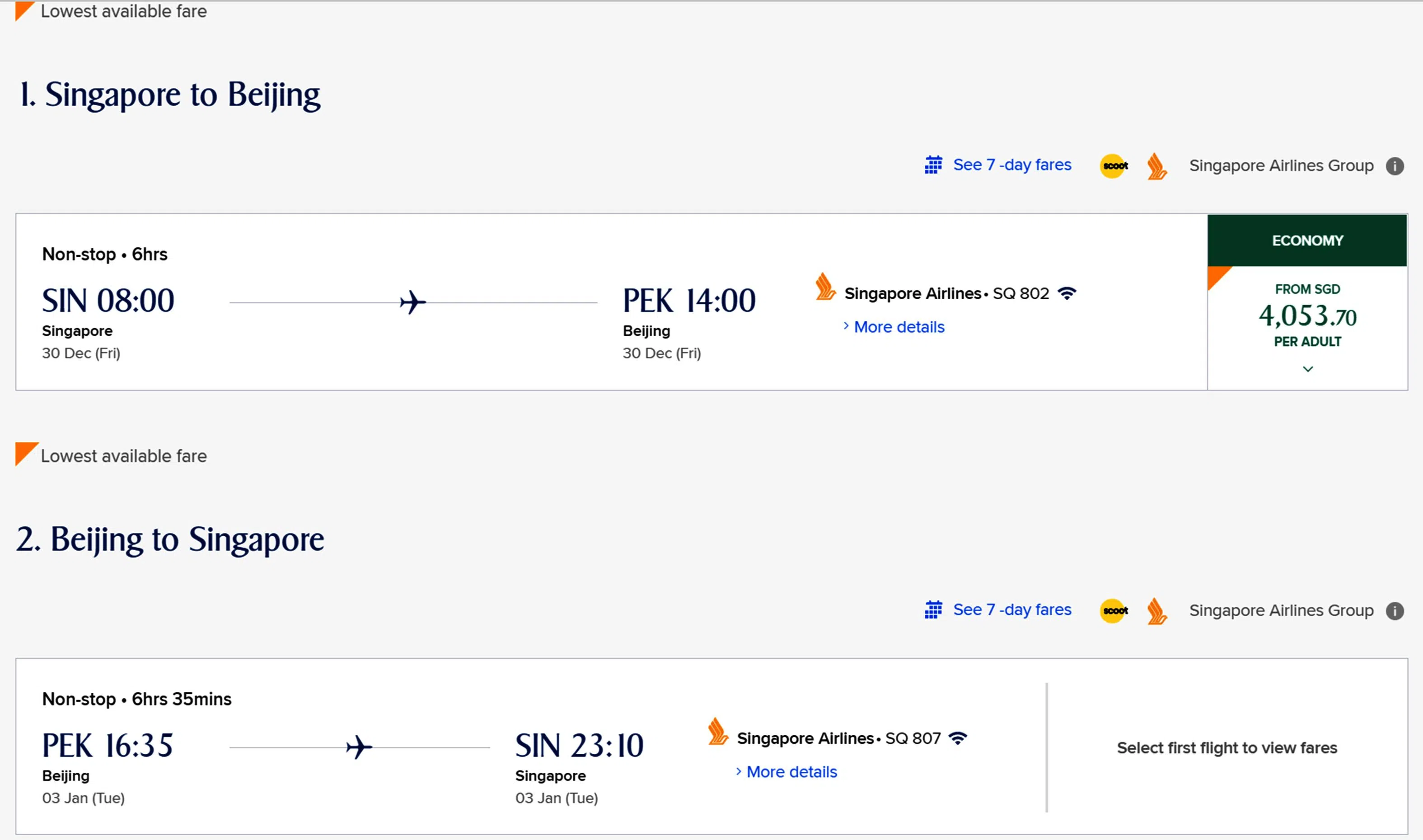 A ticket for a round trip that leaves for Beijing on Dec 30 and returns to Singapore on Jan 10 costs $2,789.