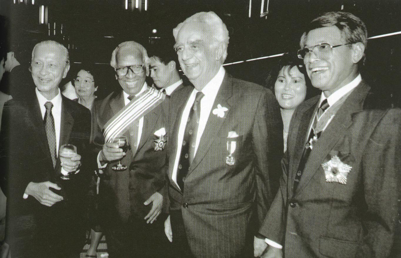 David Marshall receiving the Meritorious Service Medal for his services to Singapore in November 1990. (Left to Right): President Wee Kim Wee; S Rajaratnam (Order of Temasek, First Class); David Marshall (Meritorious Service Medal) and Othman Wok (Order of Nila Utama, Second Class).