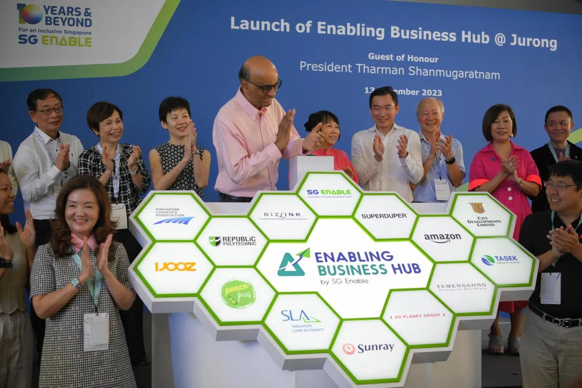 President Tharman Shanmugaratnam (centre) officially opening the Enabling Business Hub on Dec 13.