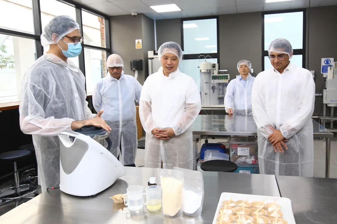 Minister of State for Trade and Industry Alvin Tan (centre) being shown samples of HerbY-Cheese on Aug 4, 2023.