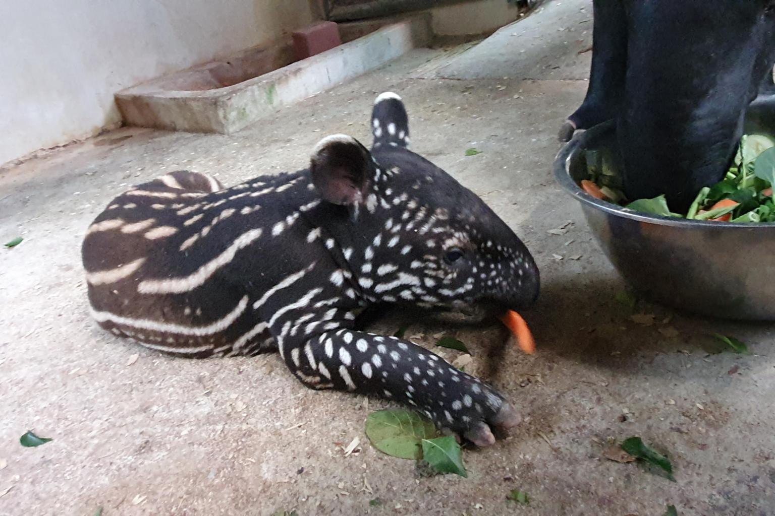 Bintang, the first male Malayan tapir calf to be born at the Night Safari since 2011, trying out solid food for the first time.