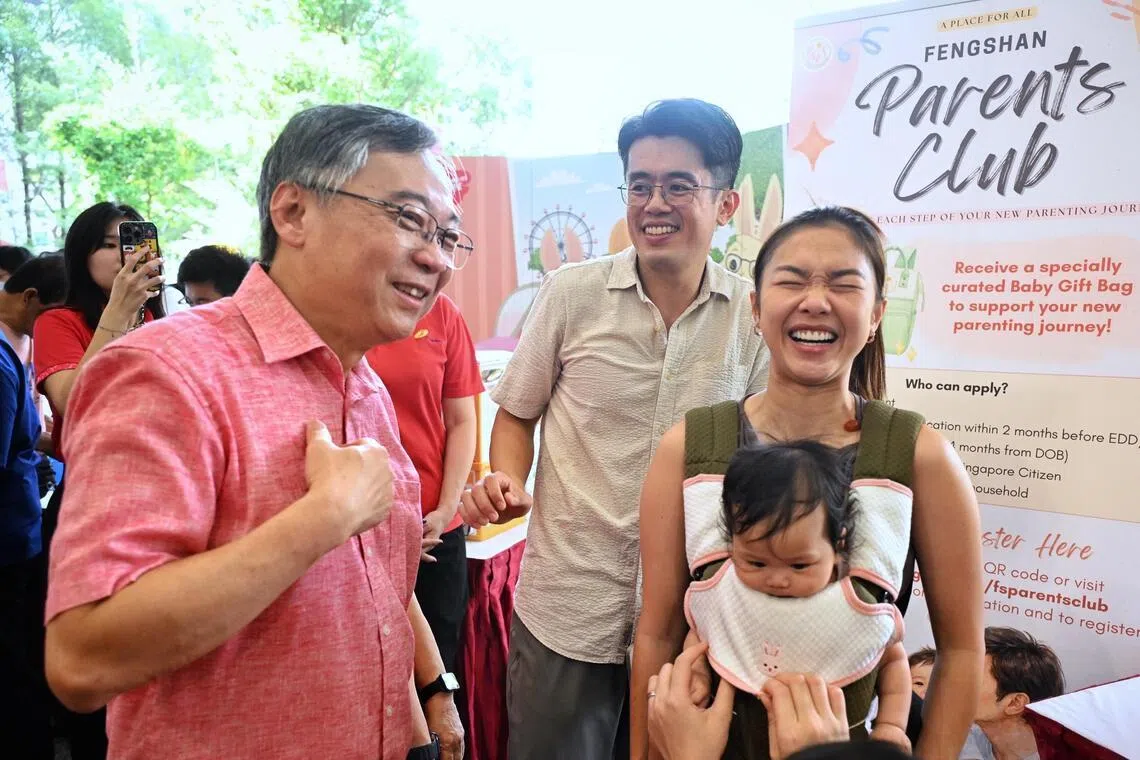 DPM Gan Kim Yong (centre), flanked by Ms Hazlina Abdul Halim, MP for East Coast GRC (right), taking over feeding duties from a mother in a light-hearted moment during a walkabout at Fengshan Hawker Centre on April 26, 2026.