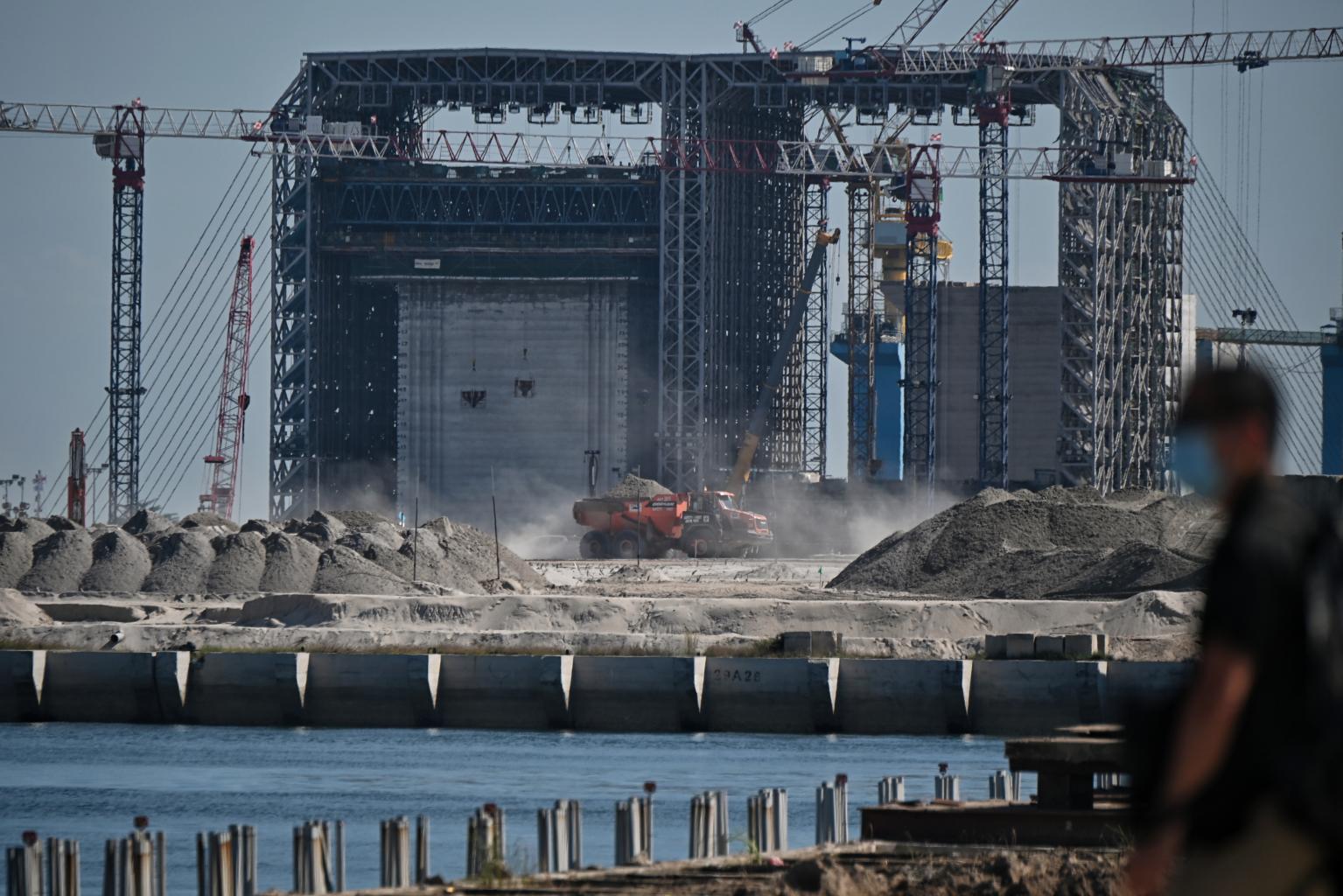A total of 221 10-storey-high structures called caissons, each about the weight of 8,000 cars, were prefabricated on land, and then laid on the seabed using a vessel to build a sea wall measuring 8.6km.