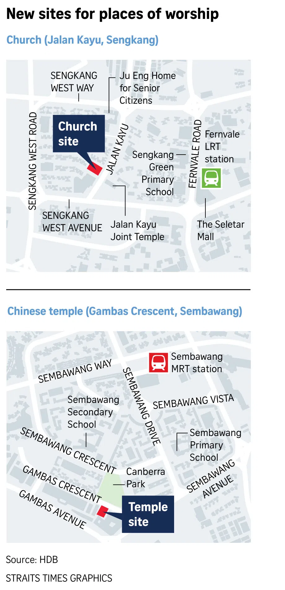 One site in Sengkang West was released for church use, and another in Sembawang for a Chinese temple, both on 30-year leases.
