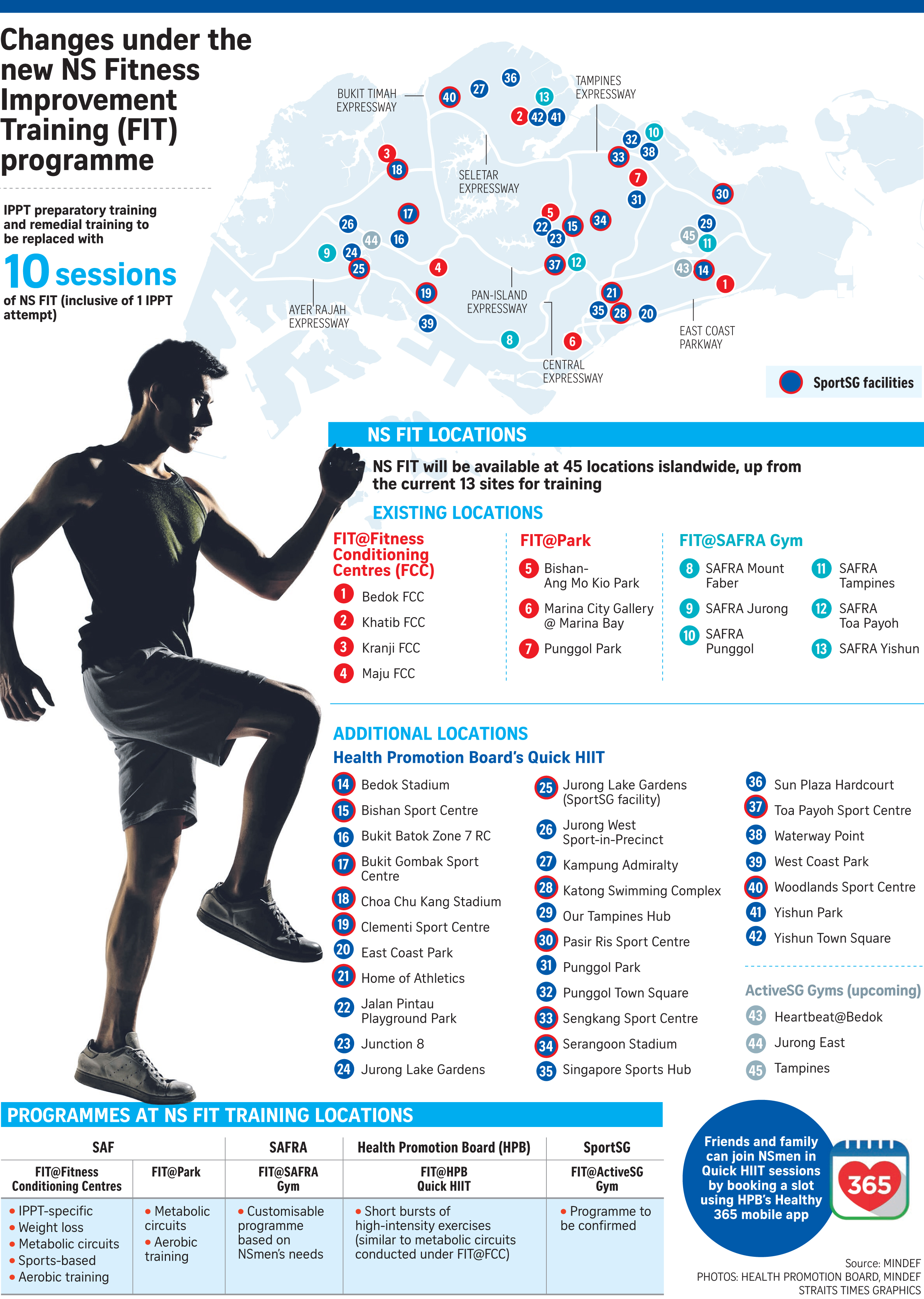 On top of existing training locations at parks, Safra gyms and fitness conditioning centres (FCCs) within army camps, NSmen can choose to undergo NS FIT at an additional three upcoming gym sites under ActiveSG - the national movement for sport - and 29 locations under HPB's Quick HIIT (high-intensity interval training) banner.