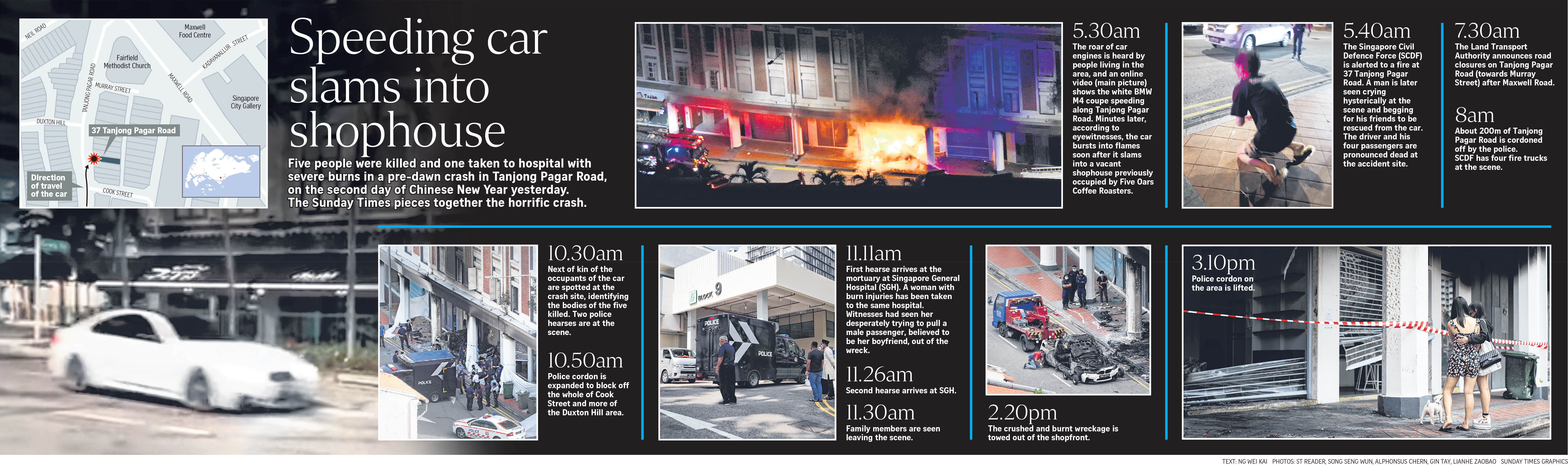 Residents of Tanjong Pagar jolted awake by cars revving their engines at 5.30am heard a loud crash as a BMW M4 Coupe smashed into a vacant shophouse in Tanjong Pagar Road and burst into flames.