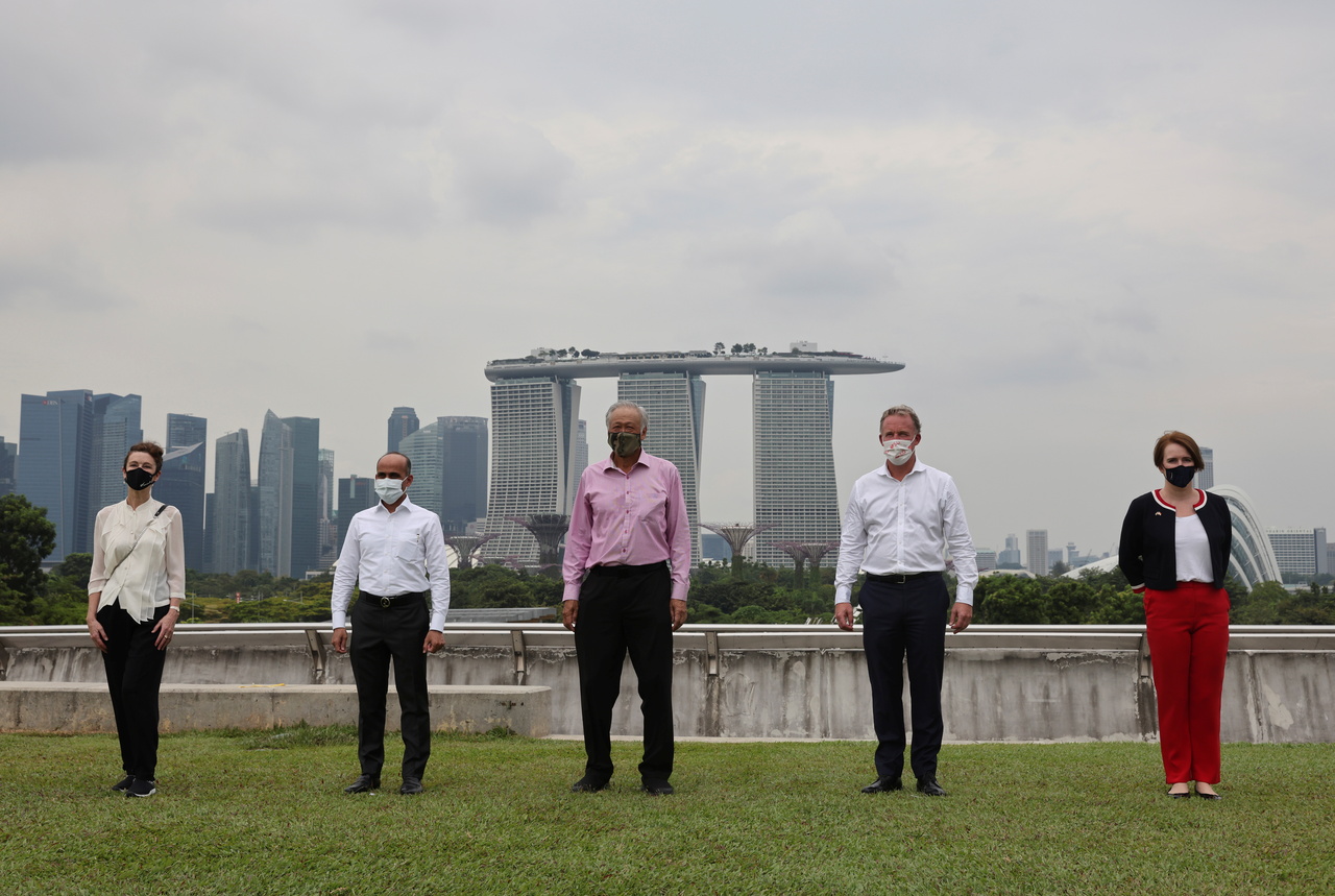 Dr Ng Eng Hen (centre) with (from left) representatives from New Zealand, Malaysia, Australia and Britain at the FPDA 50th Anniversary Flypast and Naval Vessel Display on Oct 18, 2021.