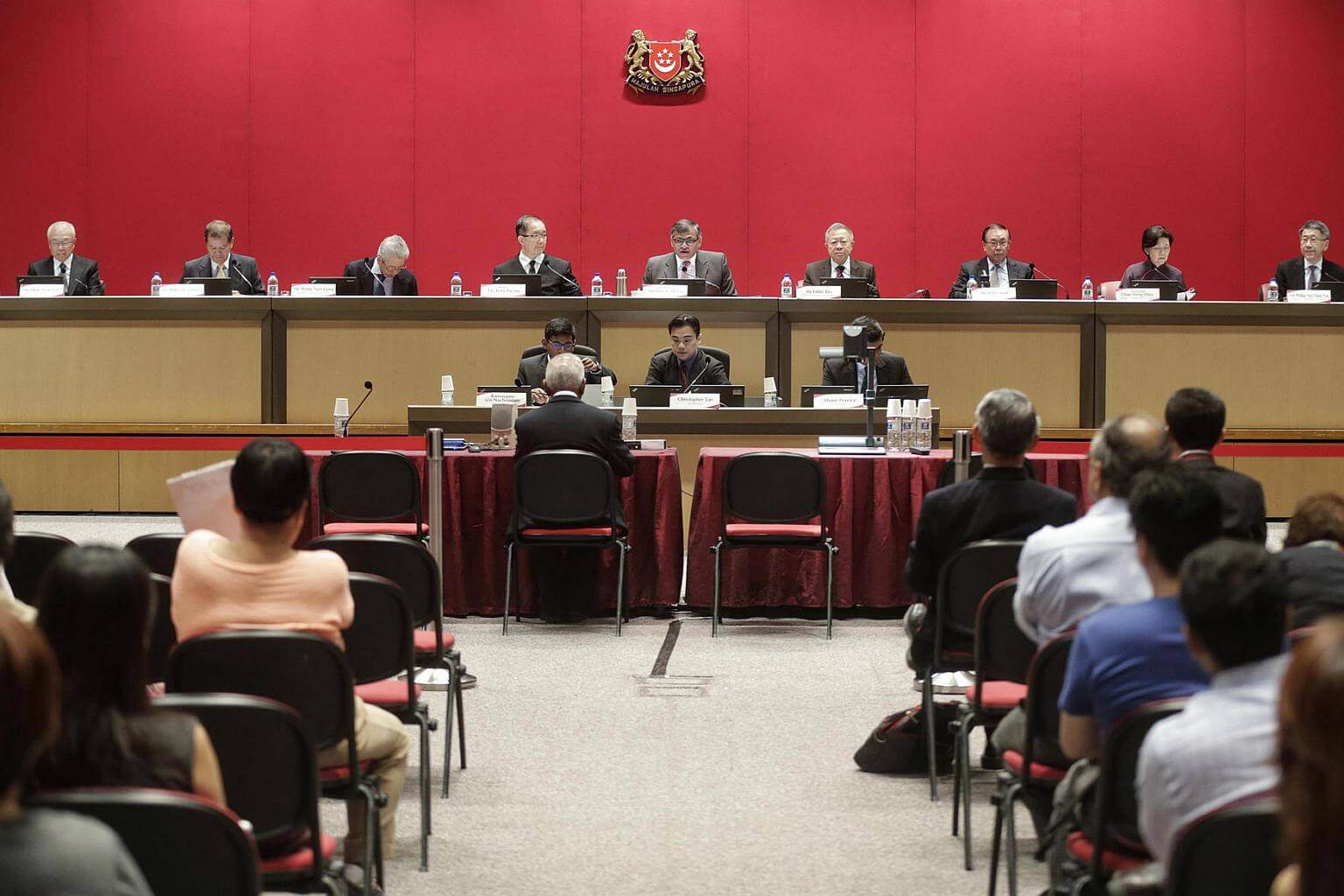 Former Cabinet minister S. Dhanabalan speaking at the Constitutional Commission hearing on elected presidency with (back row, from left) Constitutional Commission members Mr Chua Thian Poh, Mr Abdullah Tarmugi, Mr Wong Ngit Liong, Justice Tay Yong Kwang, Chief Justice Sundaresh Menon, Mr Eddie Teo, Mr Peter Seah, Professor Chan Heng Chee and Mr Philip Ng Chee Tat on Sept 7, 2016.