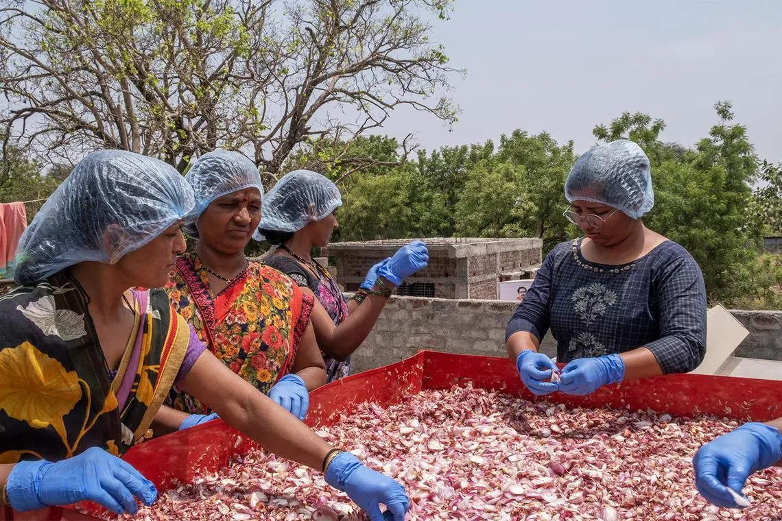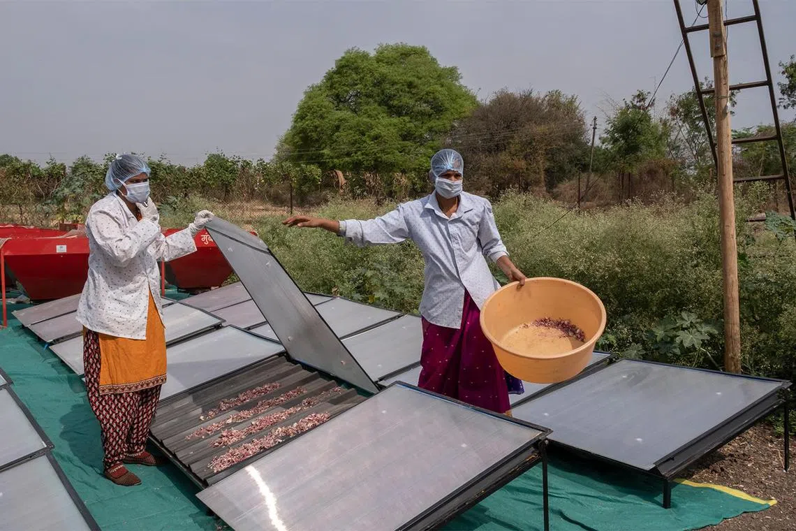 Small-holder women farmers dehydrating onions in solar-powered dryers. Food preservation equipment provided by S4S helps to prevent unsold farm produce from going to waste.