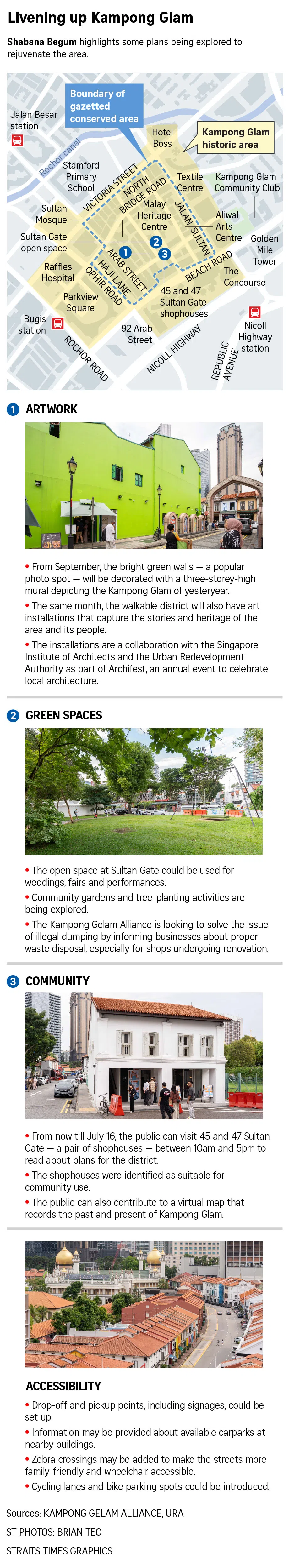 SINGAPORE - To liven up Kampong Glam and attract more visitors to the historic precinct, plans are under way to host more cultural activities, add green spaces and feature more artwork along the walkable district over the next five years.