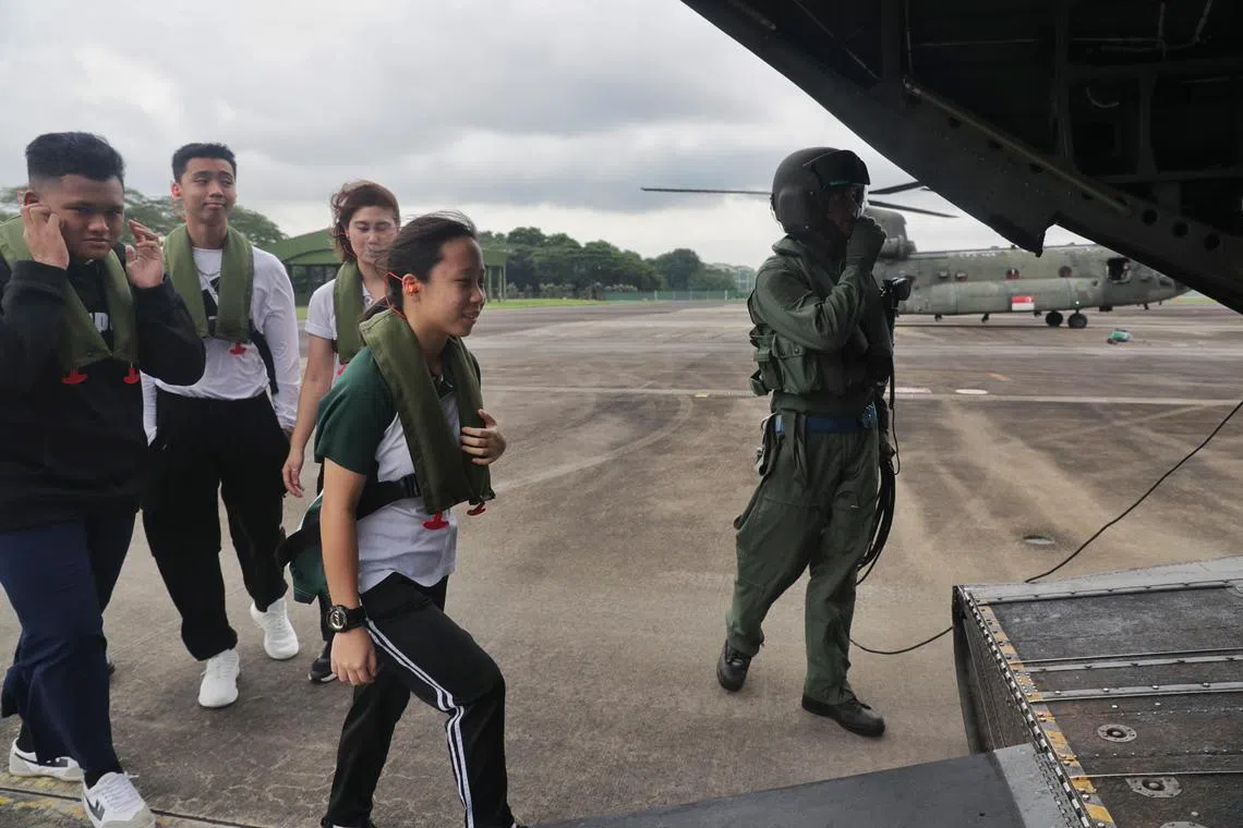 Secondary 4 student Rainer Ong En Ya boarding a Chinook helicopter at Sembawang Air Base on July 18, 2023.