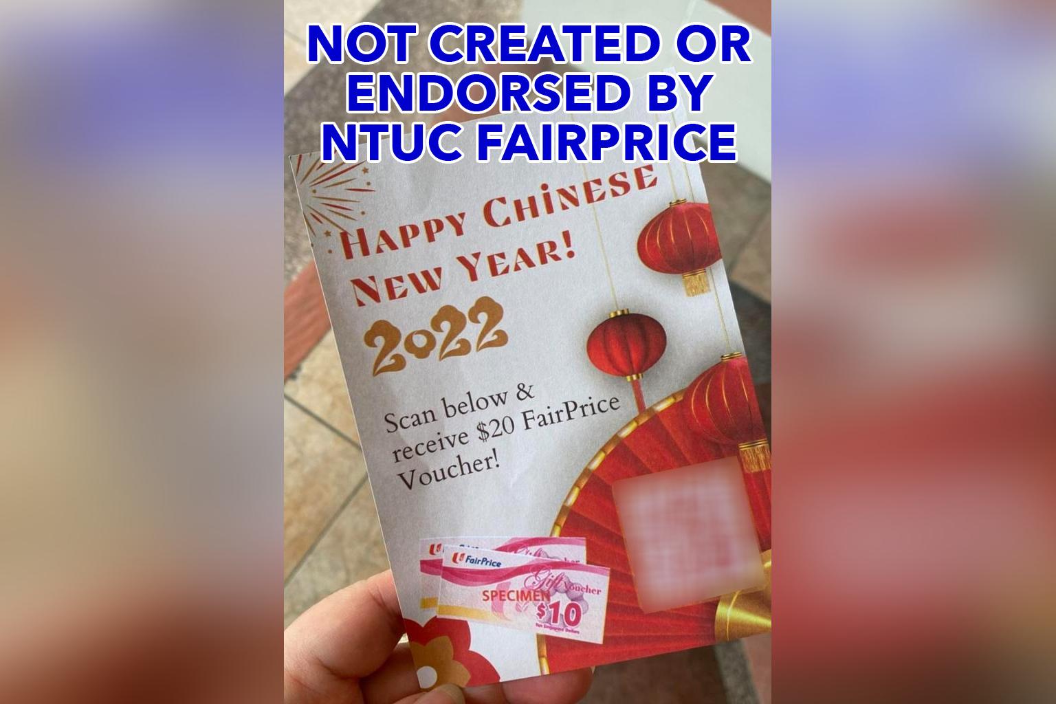 The Chinese New Year flier instructs people to scan a QR code to an online financial survey to receive $20 worth of FairPrice vouchers. It is not clear if actual FairPrice vouchers are being given out.