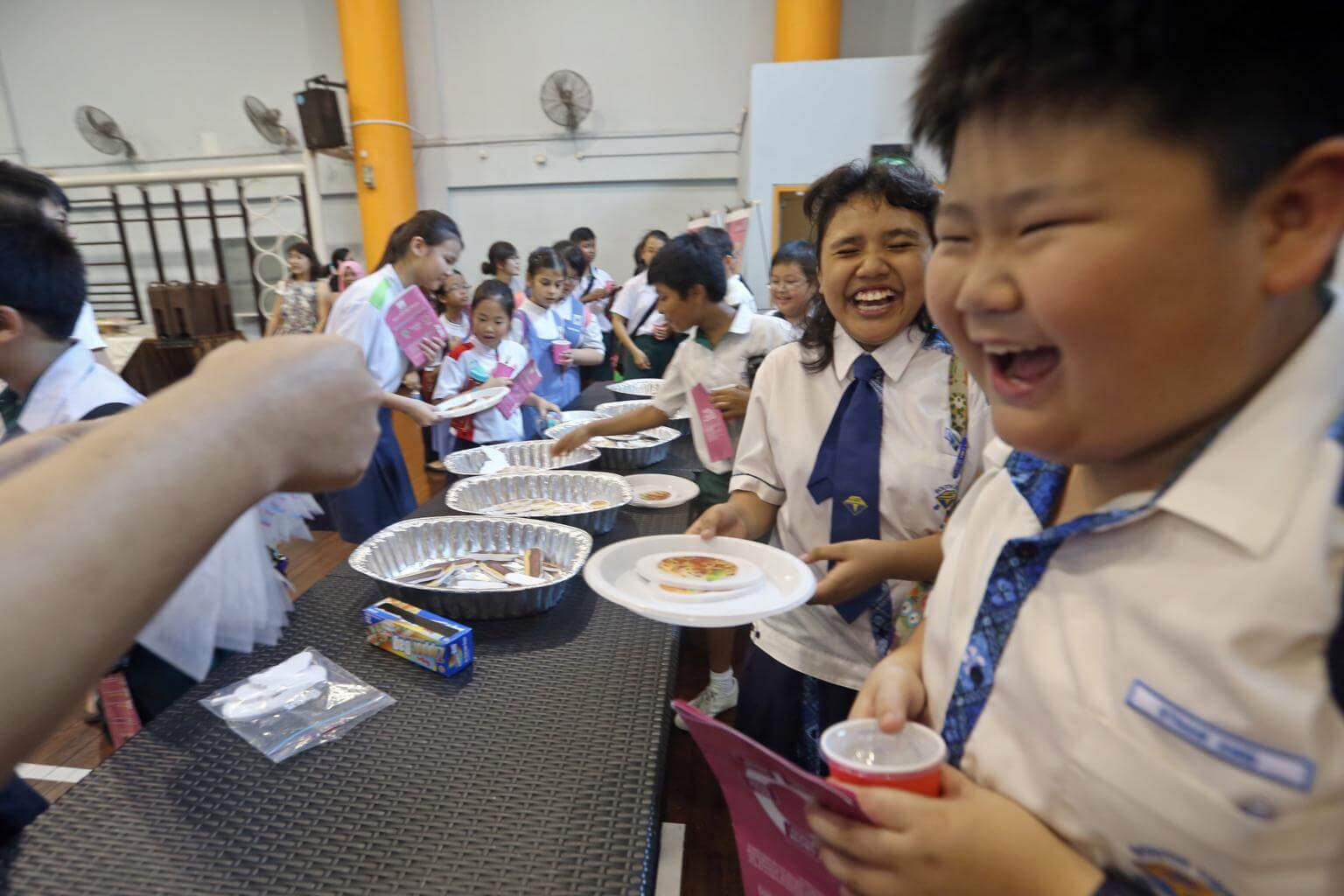 South View Primary School pupils Ethan Ang, 11, and Siti Syazwana, 11, take food from a simulated buffet at Chongzheng Primary School. Students were guided through a food waste educational trail set up at the school by the NEA.