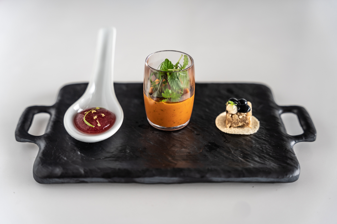 (From left) Shrimp spheres, lobster gazpacho and lobster terrine.