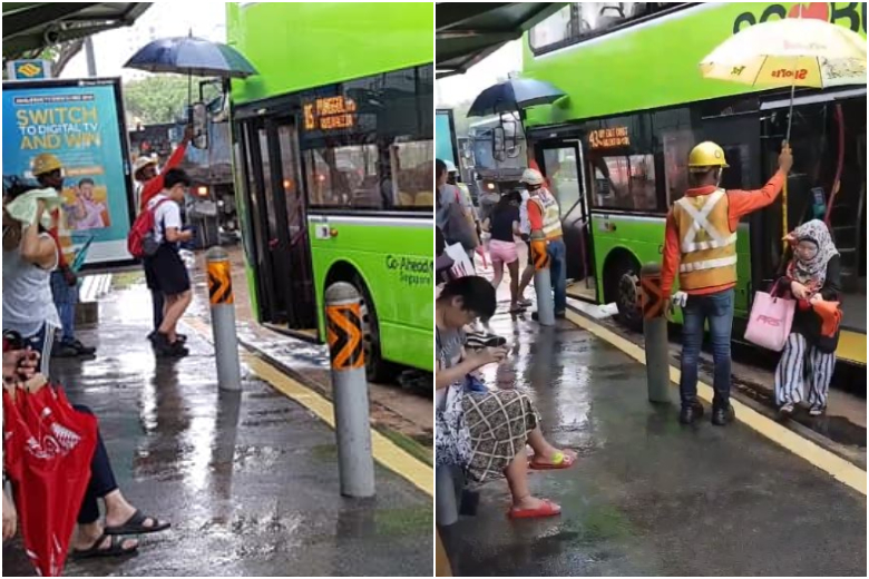 Foreign workers at Sengkang bus stop lauded for using umbrellas to shelter commuters from rain