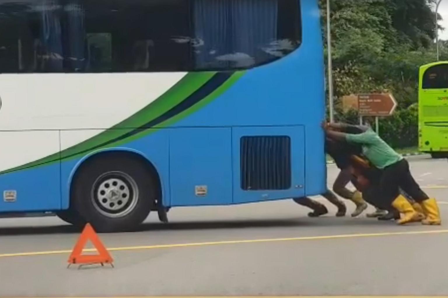 His plea was answered by a group of nearby foreign workers, who dropped what they were doing and came over to his aid, pushing away the bus and freeing up the road for traffic heading towards HarbourFront.