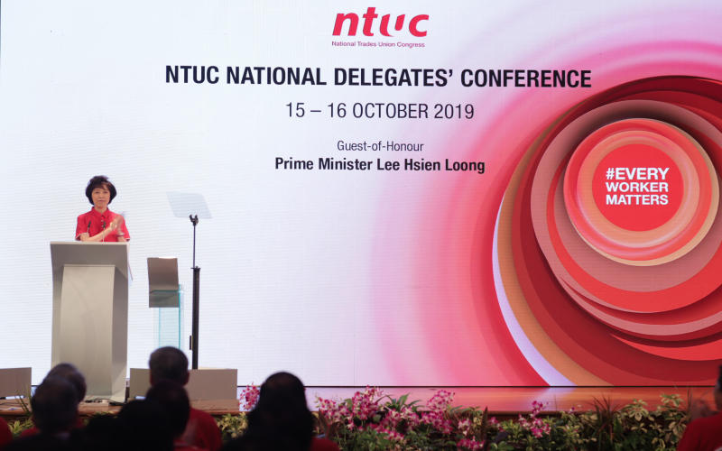 NTUC president Mary Liew delivering her welcome address at the NTUC National Delegates’ Conference 2019 on Oct 15, 2019. She was re-elected to lead NTUC as president on Oct 16.