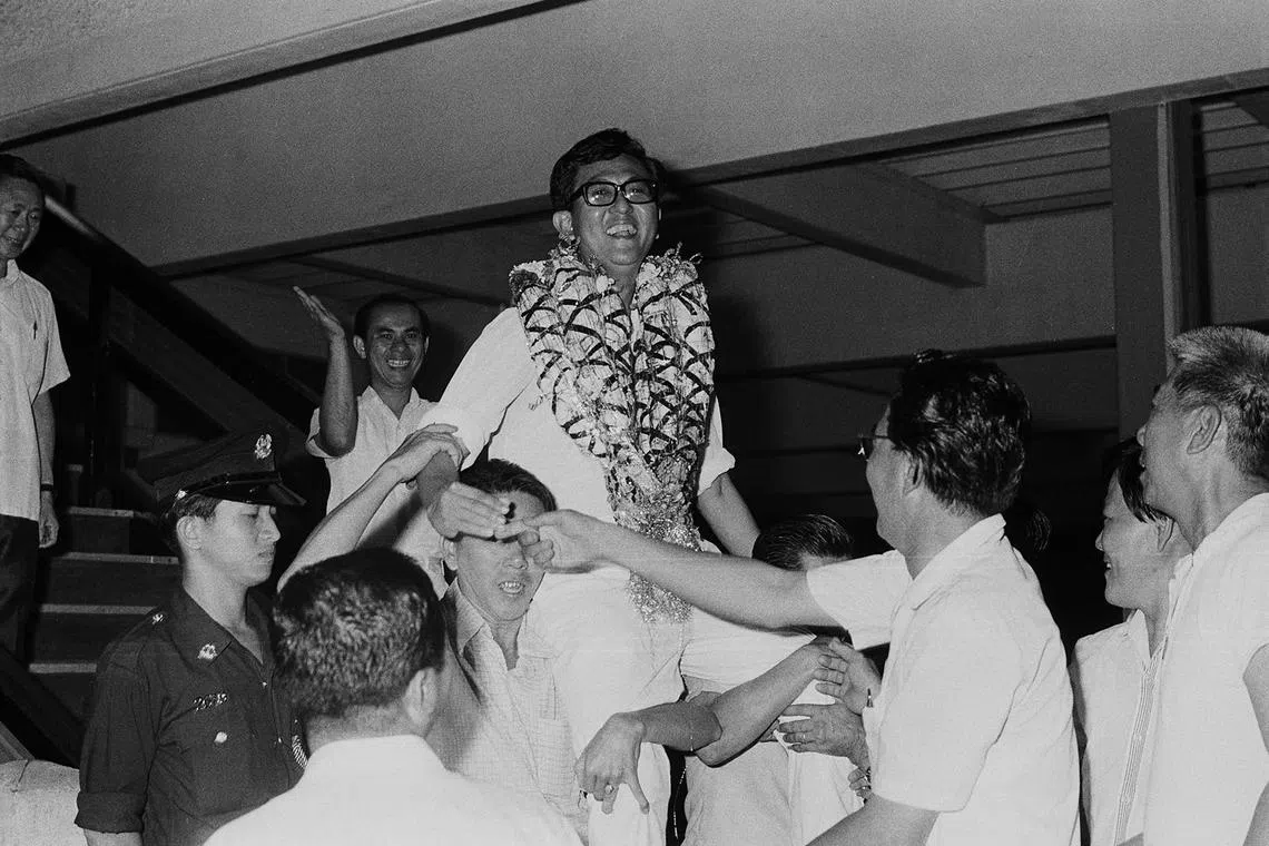 Mr Ch’ng Jit Koon, PAP candidate for Tiong Bahru, celebrating his victory in the 1972 General Election.