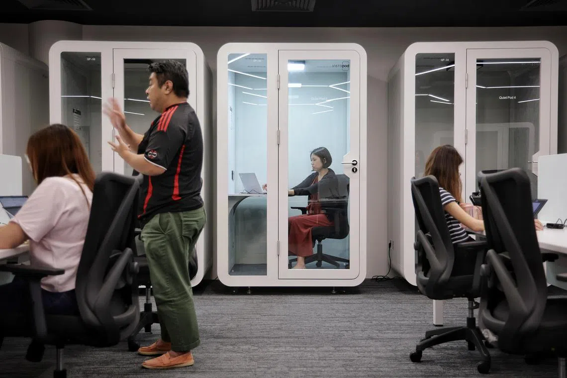 The Tampines satellite office, which can seat about 100 people, has amenities such as individual workstations, quiet pods designed for calls, four-seat work booths, enclosed discussion rooms, each with a capacity of four to six people, enclosed meeting rooms that can fit groups of 10 to 20 each, and various large tables for group discussions.