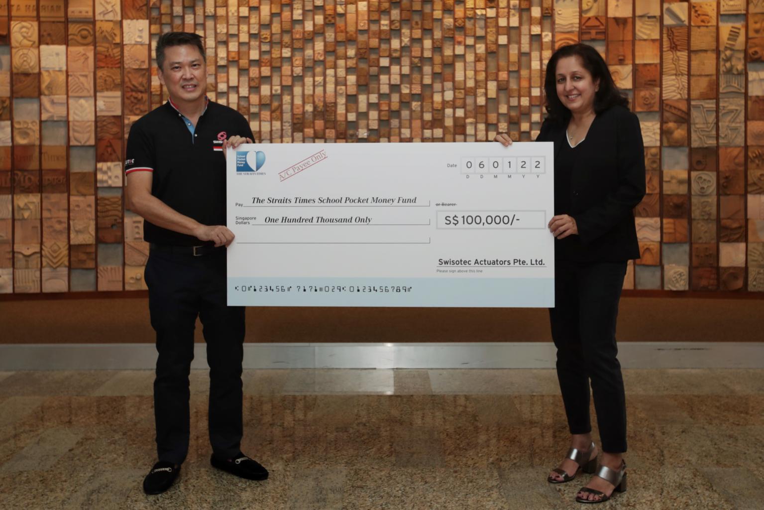 He donated $100,000 to The Straits Times School Pocket Money Fund on Thursday (Jan 6), presenting a cheque to the secretary of the fund, ST news editor Karamjit Kaur, at the SPH News Centre lobby.