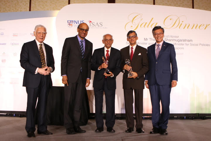 (From left) Institute of South Asian Studies (ISAS) chairman Gopinath Pillai, Senior Minister Tharman Shanmugaratnam, veteran civil servant J. Y. Pillay, Mr Manzoor Hasan, receiving an award on behalf of Brac founder Fazle Hasan Abed, and National University of Singapore president Tan Eng Chye at a gala dinner marking the start of the two-day 4th South Asian Diaspora Convention.