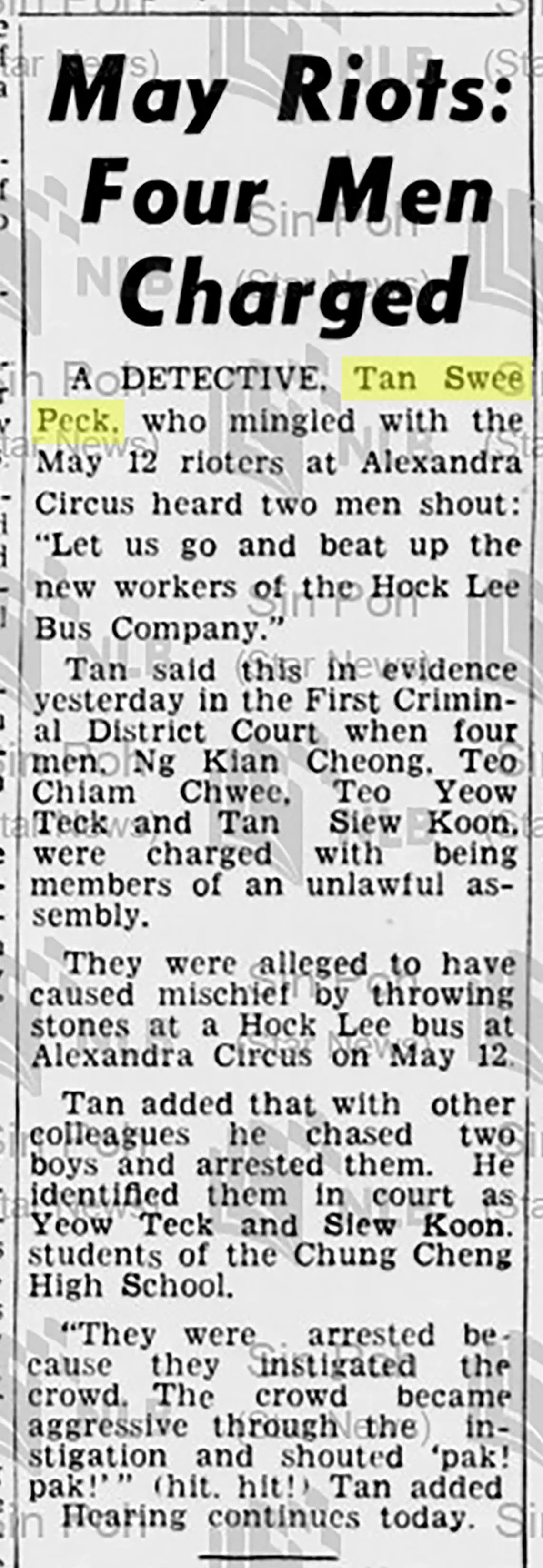 Buried deep in her camera roll, the photographed text quoted “Tan Swee Peck’s” court testimony of his work in the 1955 Hock Lee bus riots.