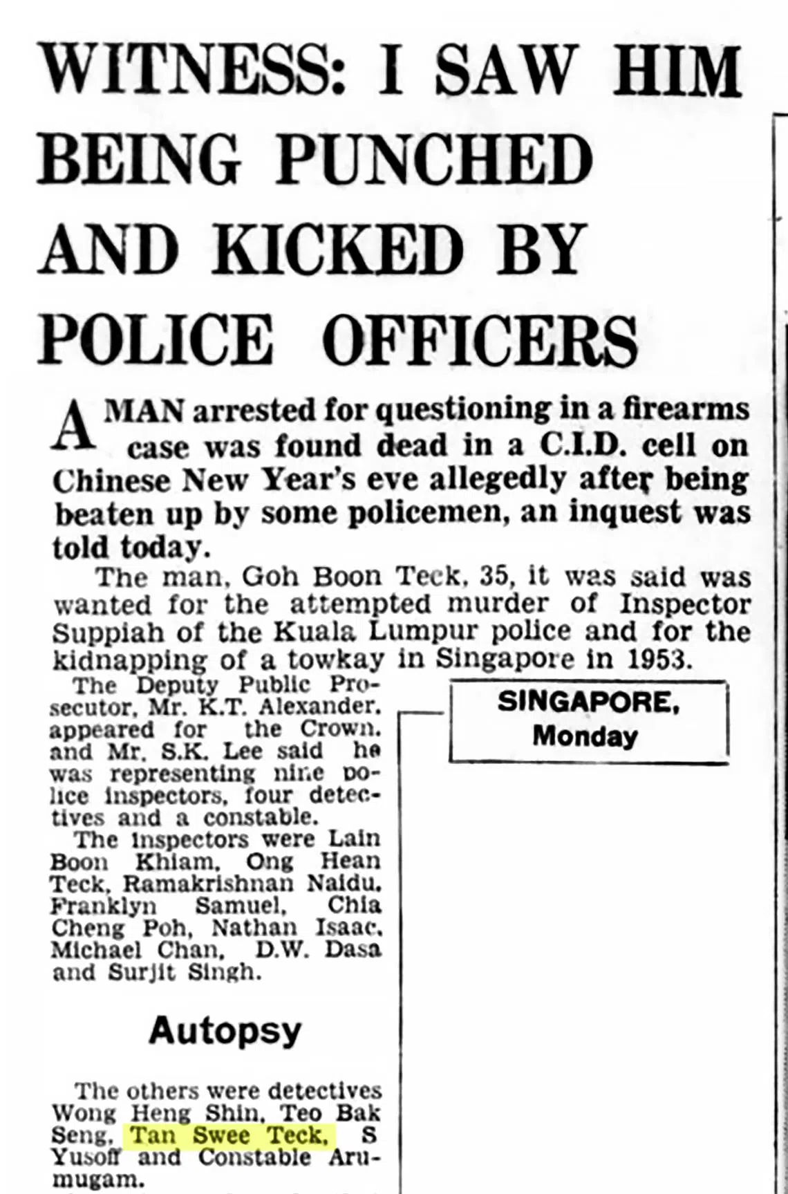 A May 30, 1961, report about a thug who died in police custody alleged that policemen – including the writer’s grandfather – were involved. Detective Tan Swee Teck was later found not guilty.