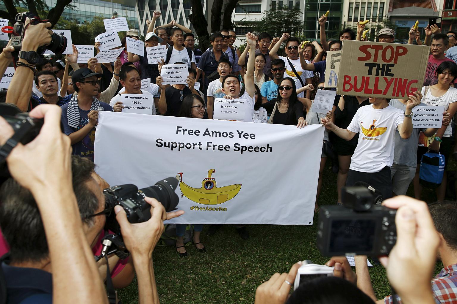 Meanwhile, a protest in support of Amos was also held in Hong Kong yesterday. Fifty people from different civic and political groups gathered outside the commercial building in Admiralty where the Singapore Consulate-General is located. They demanded the immediate release of Yee.