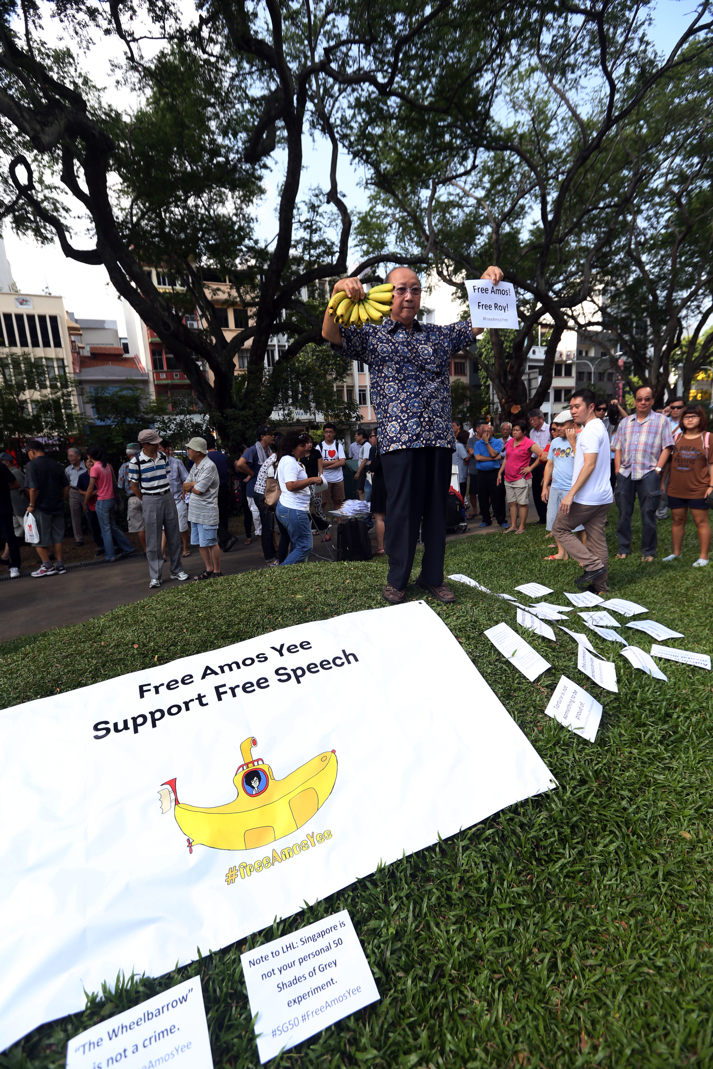 Organiser Jolovan Wham (centre) and participants during a protest to free blogger Amos Yee, at Hong Lim Park, on July 5, 2015.