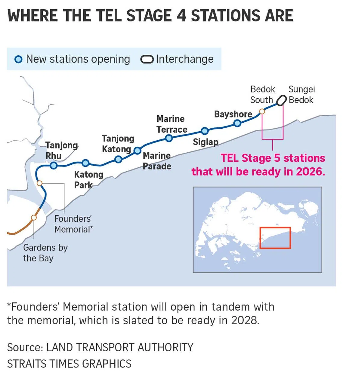 The fifth and final stage of the TEL – comprising Bedok South and Sungei Bedok stations – is slated to open in 2026.