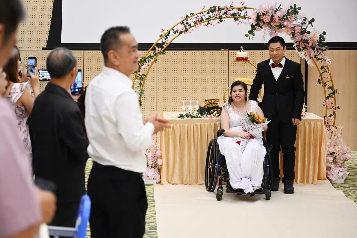 SINGAPORE – The room at the Safra Clubhouse in Choa Chu Kang on Nov 26 bore all the hallmarks of a regular wedding – cheering family and friends, a three-tiered wedding cake, wine and a couple besotted with each other.