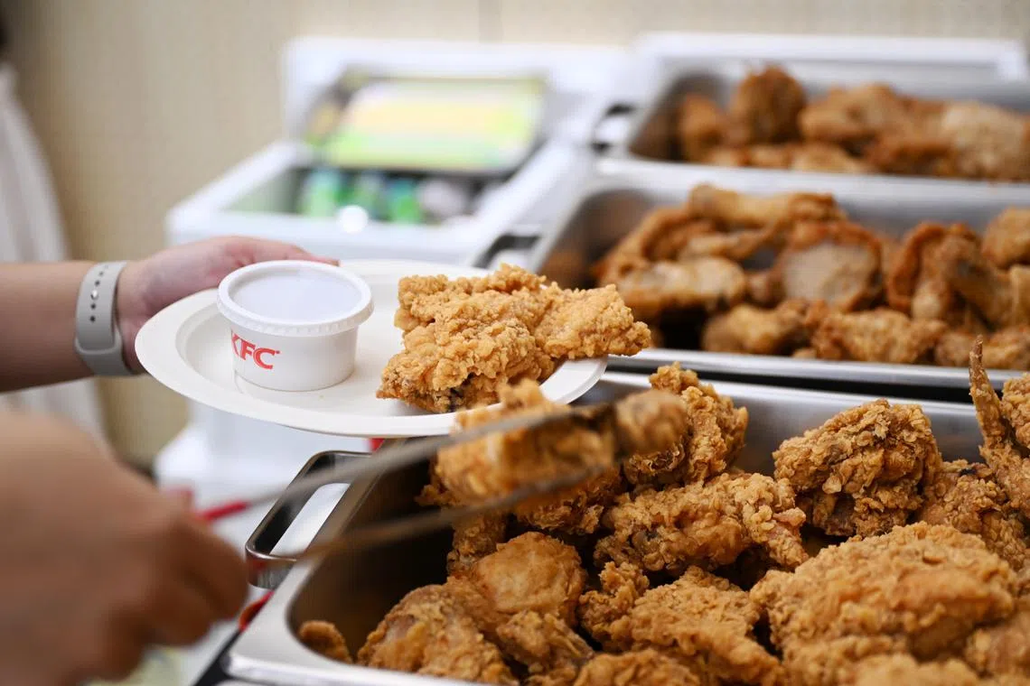 Another glaring clue that this was a wedding with a difference: A red-and-white backdrop replete with an image of a Zinger burger was set up next to the table that held the cake, and the buffet spread, in Ms Wong and her husband Xie Peng’s view, was “finger lickin’ good”.