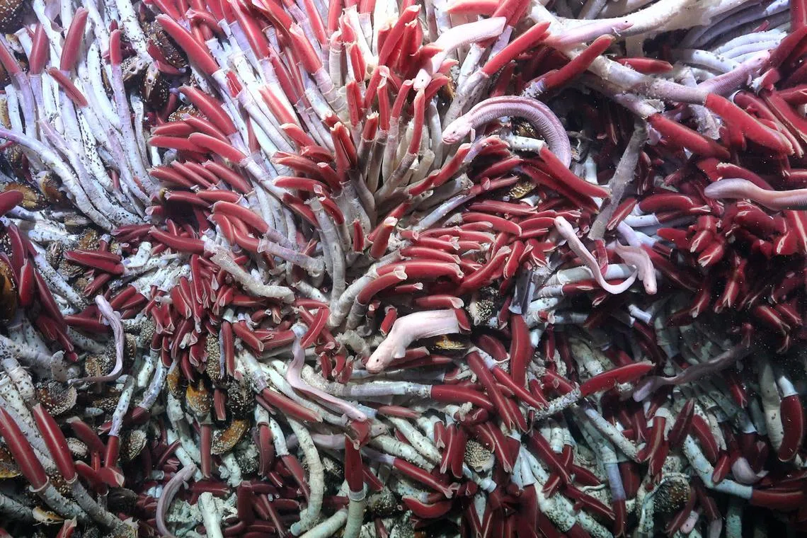 A large cluster of tubeworms on a vent system over 2,500 metres beneath the surface.