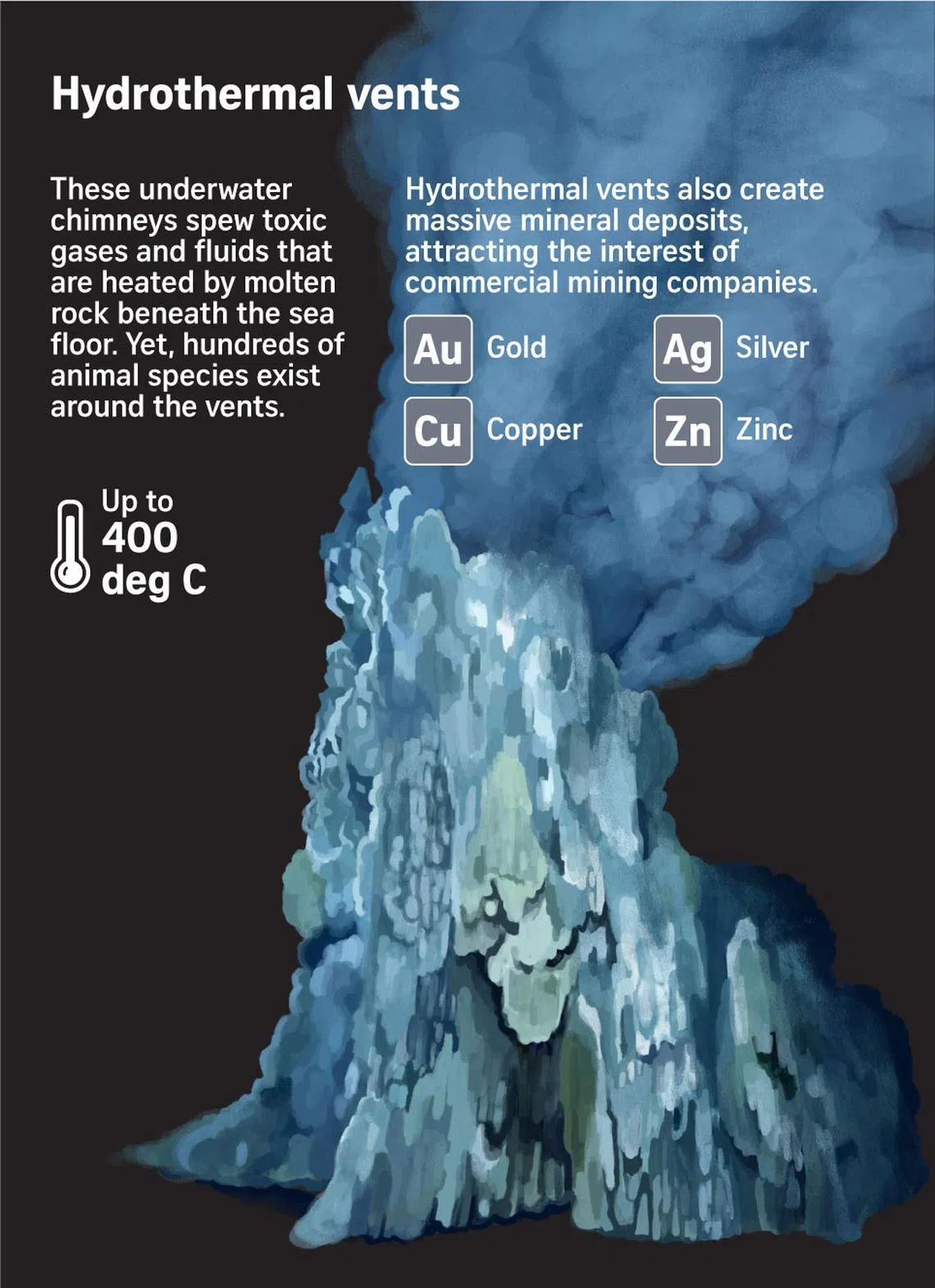 Valuable metals such as copper, gold, silver and zinc have also been found surrounding hydrothermal vents – fissures on the sea floor that spew toxic gases, fluids and sulphur compounds – attracting the interest of deep-sea mining companies.
