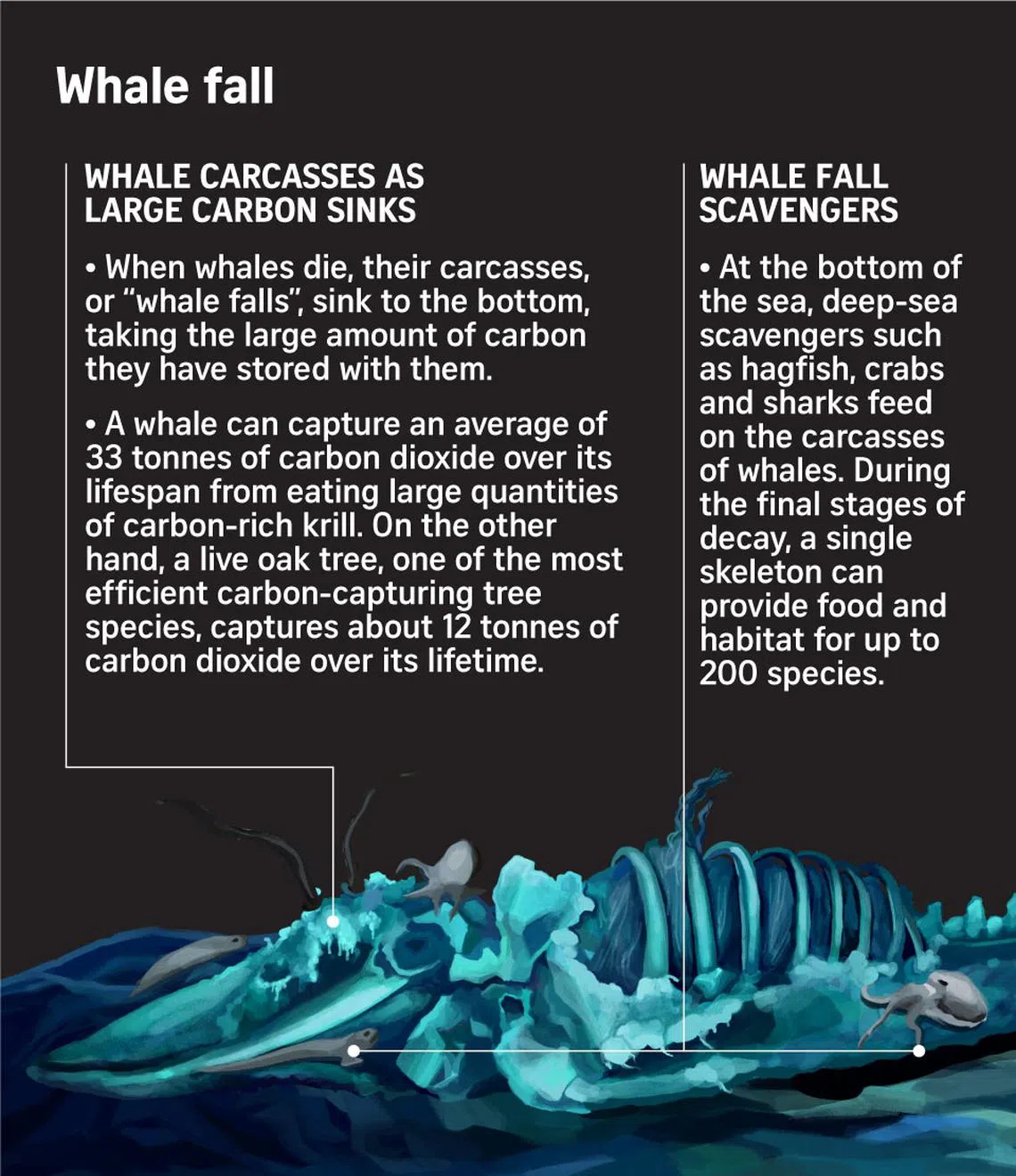 In this way, the carbon that whales accumulate throughout their long lifespans and in their enormous bodies is transferred to the deep sea as they decay.