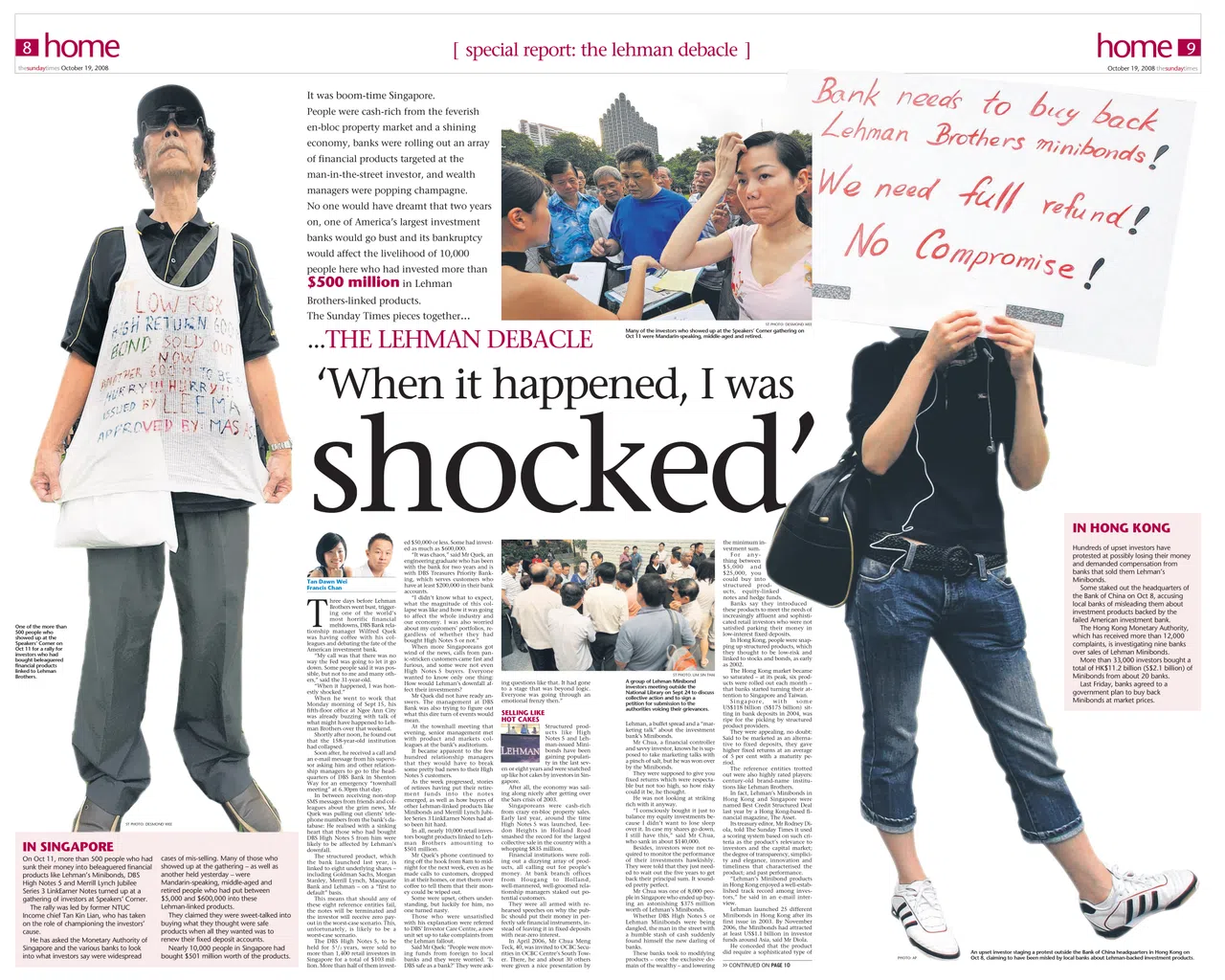 Public anger erupted when thousands of consumers lost their savings in complex investment products linked to Lehman Brothers, such as Minibonds and High Notes 5. About 10,000 retail investors, including the elderly and less educated, lost over $500 million in products sold by financial institutions here.