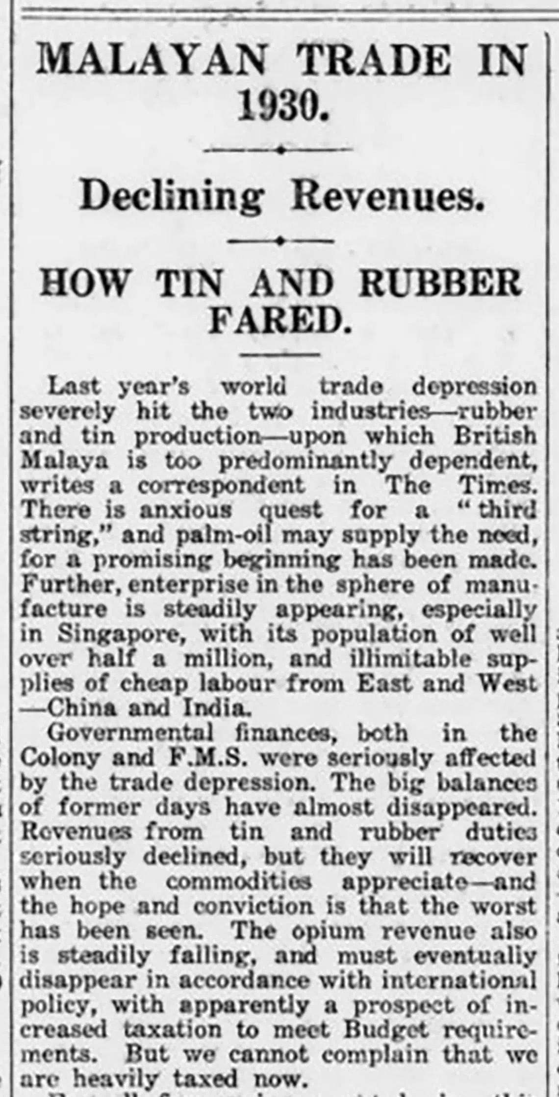 The article highlighted how the global downturn, which began in 1929, severely affected the two mainstays of Malayan trade: tin and rubber. Even opium, then still legally traded, was declining as a revenue source.