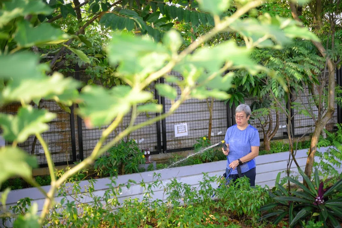 Kampung Admiralty resident Doris Yuen watering plants at the community garden.