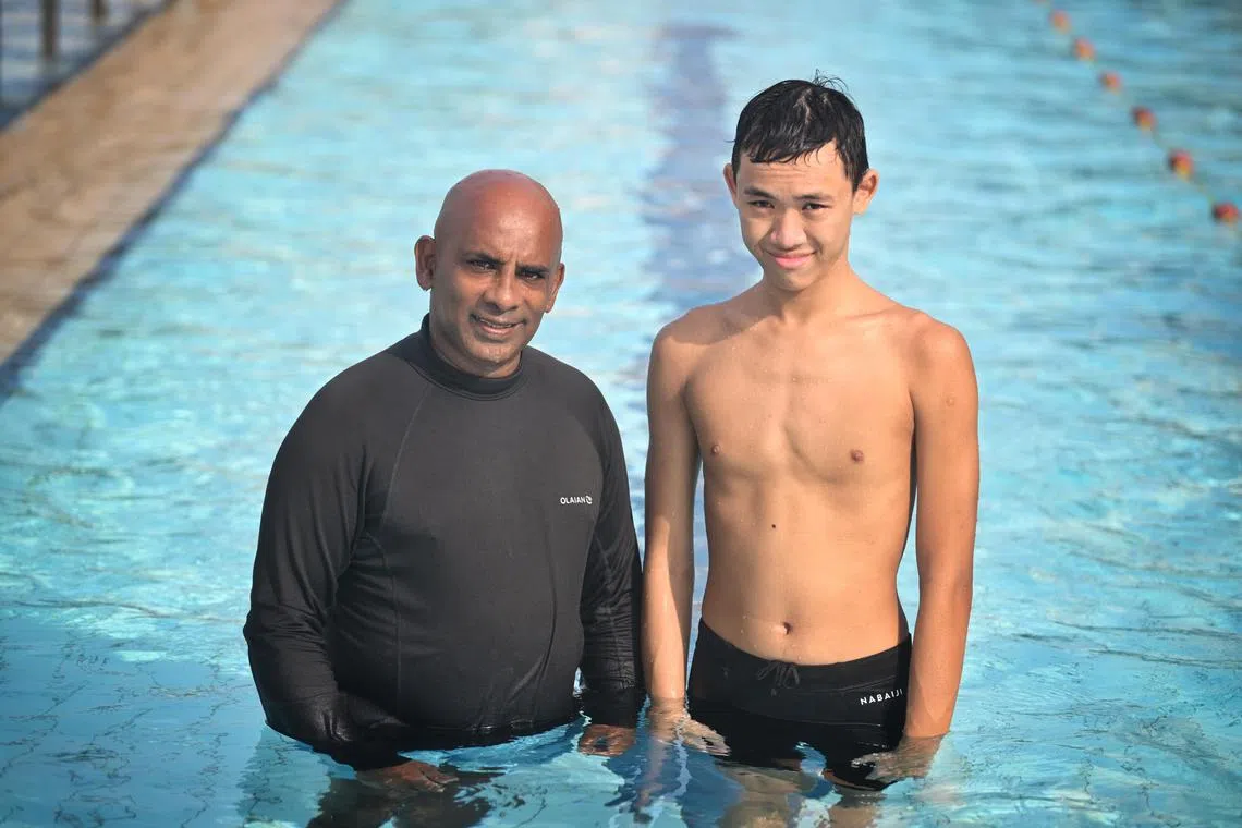 Mr Teo Yong Le and his coach Silas Parasurmam at Jurong West Swimming Complex on Jan 14, 2023.