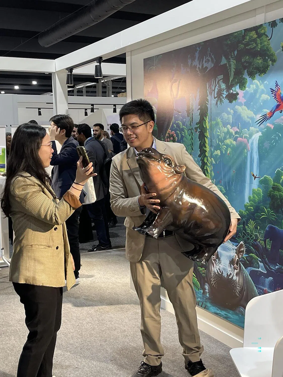 Weary delegates in need of some stress relief have been rushing to snap pictures with a Moo Deng doll. The pictures are then printed on a magnet.