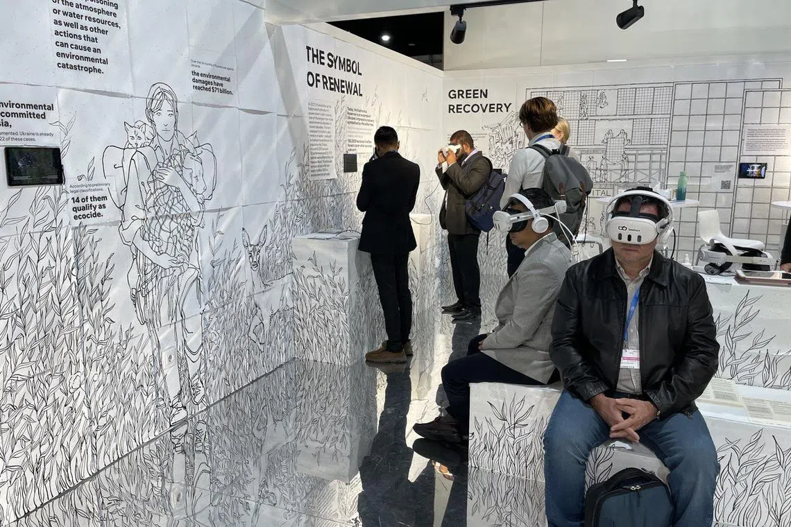 Most country pavilions are made of sturdy panels, concrete or wood. But the walls of the Ukraine pavilion are made of recycled paper, with plant seeds embedded in them, symbolising regrowth. The country’s green recovery plans and environmental initiatives are illustrated through a sprawling mural across the walls of paper.