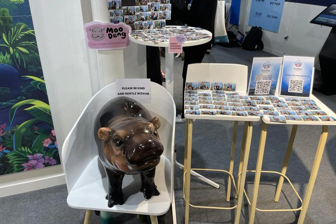While pavilions offer free food, coffee and merchandise to attract visitors, the Thailand pavilion has been milking its recent internet sensation – the baby pygmy hippopotamus Moo Deng.